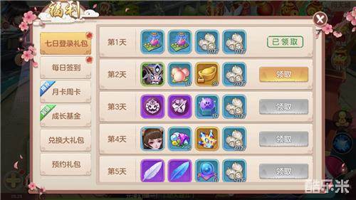 登录七天,每天获得不同礼包,逐天增加礼包的价值。有经验丹、银币、稀有道具材料、异兽等多种礼物。