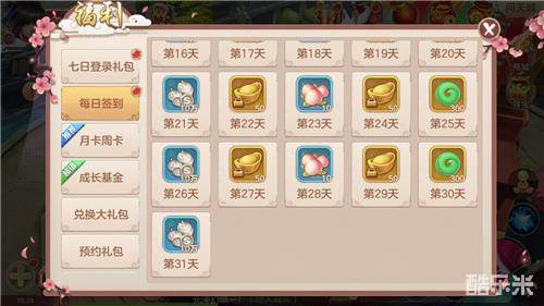 月打卡,可获得银币、瞬加经验的蟠桃、绑定元宝、抽取异兽符篆的符篆精华等道具。