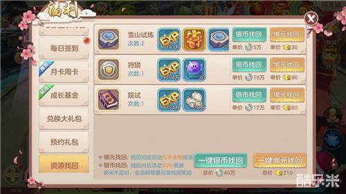 通过绑元或银元找回在雪山试练、狩猎和院试中的资源。银币可以找回对应活动50%的资源,绑元则可找回100%的资源。资源包括有巨额经验、专属装备宝箱、强化石、宠物进阶丹、银币等稀有资源。