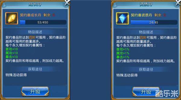当玩家契约兽品阶达到4阶时,就可以使用契约兽成长丹和资质丹了,成长丹主要按固定值提升契约兽的普攻,属攻和暴击,资质丹主要按百分比提升契约兽的普攻,属攻和暴击,品阶越高,可使用的丹药数量也越多。成长丹和资质丹都是通过特殊活动获得的。