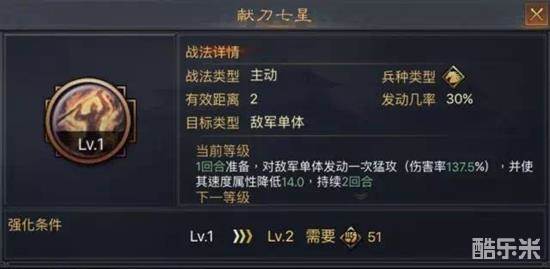 【献刀七星】满级效果为1回合准备,对目标猛攻(伤害率275%),同时使其速度属性下降28,持续2回合。从伤害来看,275%在四星武将中算是比较高的的水平。