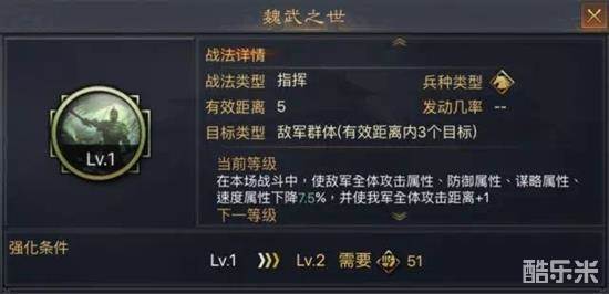 目标为敌军单体,也就是说发动战法一次只对攻击距离内的一个敌军单体造成伤害和debuff效果。