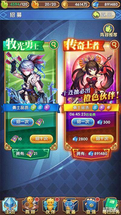其中牧光勇士是普通的招募方式最多可招募到紫色的伙伴,而传奇王者则是能够招揽到橙色神将的高级招募,甚至十连抽更是能将橙将保底在手哦!两种招募虽然消耗程度不尽相同,但都同样是有着免费抽取的机会,还请玩家们珍惜,切莫错过机会。