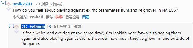 Q:在NA LCS联赛中即将和前Fnatic队友Huni和Reignover交手的感觉如何?