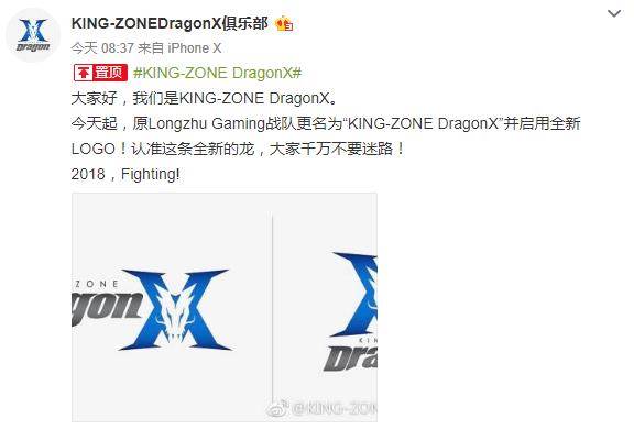 今天起,原Longzhu Gaming战队更名为“KING-ZONE DragonX”并启用全新LOGO!认准这条全新的龙,大家千万不要迷路!