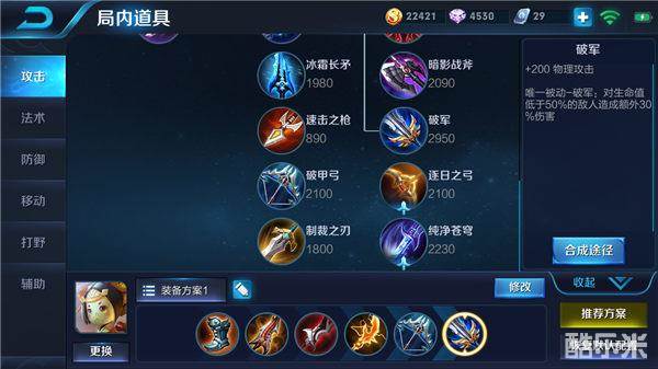 破军可以在后期为鲁班七号带来极为不俗的伤害输出,同时借助破军的被动效果,鲁班七号可以轻易的对血量低于一定百分比的敌人造成极高的伤害。