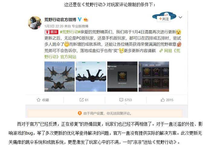 在最近一次1月4日《荒野行动》的更新中,主要对游戏增加了“多人跳伞”和成就系统之后,官方微博底下满满的都是对游戏的吐槽和BUG投诉: