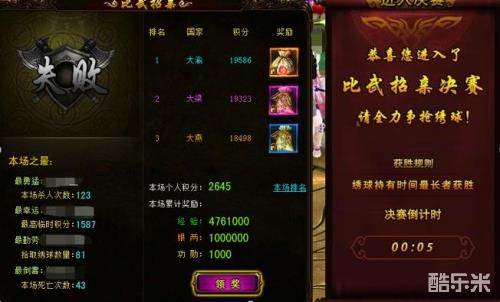决赛范围就只有在台子上,决赛时间只有5分钟,先在台子中间出现一个绣球,然后大家去抢~击杀持有绣球的玩家你可以获得绣球,谁持有绣球最久谁就是第一,根据排名不同获得的奖励也不同。