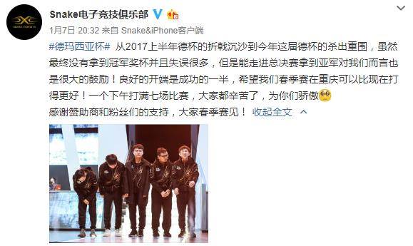 2018年1月7日,德玛西亚杯青岛冬季赛,Snake1:3憾负EDG,拿下亚军。然而这一次,大战七场,虽败犹荣。