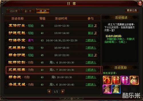 琅琊榜里等级达到40级就能够参加我们的比武招亲活动,在服务器开服的天晚上就会开启激烈的厮杀!