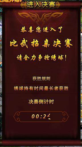 活动持续5分钟结束后会产生终的排名,在后时间结束节点上任然持有绣球的玩家系统会给这个玩家奖励30秒的持有时间的哦!如果后产生了时间相同的排名,就会把之前在比武招亲海选赛的排名积分作为排名的判断依据的哦!后获得的奖励: