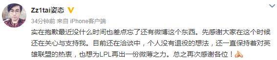 实在抱歉最近没什么时间也差点忘了还有微博这个东西。先感谢大家在这个时候还在关心与支持我。目前还在洽谈中,个人没有退役的想法,还一直保持着对英雄联盟的热衷,也想为LPL再出一份微薄之力。总之再次感谢各位!