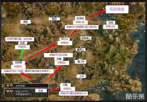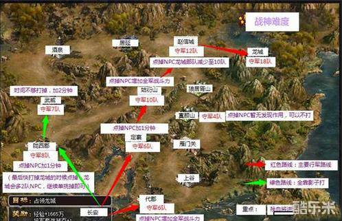 到最后一个难度了(不容易啊,将军套图纸终于可以到手了),这个难度下敌方兵力真的突出一个多,太多了,实在是多。没错,就像上海上班高峰期地铁的景象。开局打法与炼狱打法类似,但是本次又多了两个事件,一个是真颜山的事件,点完定襄的事件之后会出现,但是毫无意义,没错,就是毫无意义!我点完之后神马都没发现,就是来卖萌的么???这个先不提,姑衍山也多了个事件,点掉这个NPC同样会增加全军战斗力,还算是不错的事件,按照地图上所标不同颜色的箭头来进军,途中也说明了,绿色箭头全靠影子打,红色箭头是我们进军路线,那个真颜山的事件就不要管了,赵信城尽快打掉并点掉NPC,不过在打赵信城的时候也可以顺便派一个残血武将进龙城偷偷放几个影子先,等龙城快要打下来的时候(还剩三队兵左右),派一个武将回到陇西郡以及武威把事件点掉,龙城会陡然多两队兵,别紧张,杂鱼而已,赶紧单挑点掉即可。