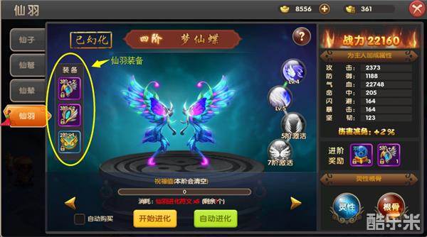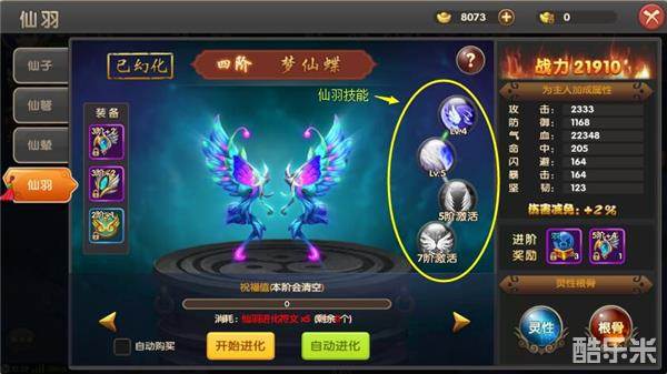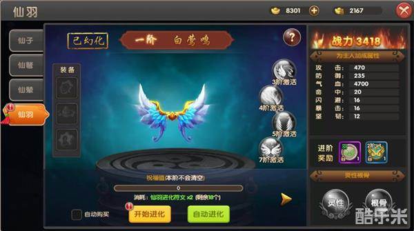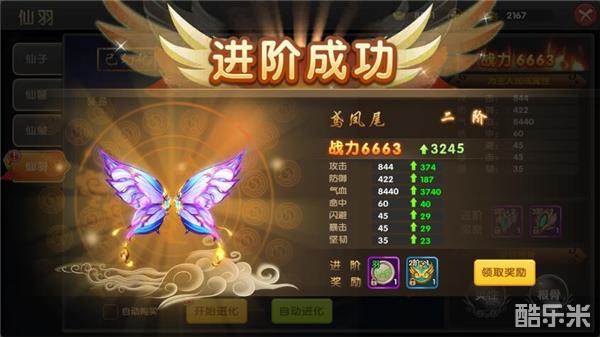 3.仙羽进阶成功后不仅能增加更多属性,还能获得更炫酷外形的高阶仙羽。