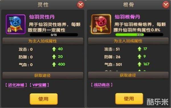 3.仙羽的阶数越高,可使用的灵性丹和根骨丹越多,同样每颗灵性丹和根骨丹增加的属性越多。