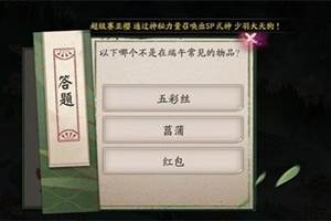 阴阳师以下哪个不是在端午常见的物品?在今日更新的端午节浅夏趣闻活动当中,需要玩家回答一些问题。想必很多玩家还不清楚答案是什么。下面就让小编给大家带来相关的答案分享内容,一起来看看吧。《阴阳师》以下哪个