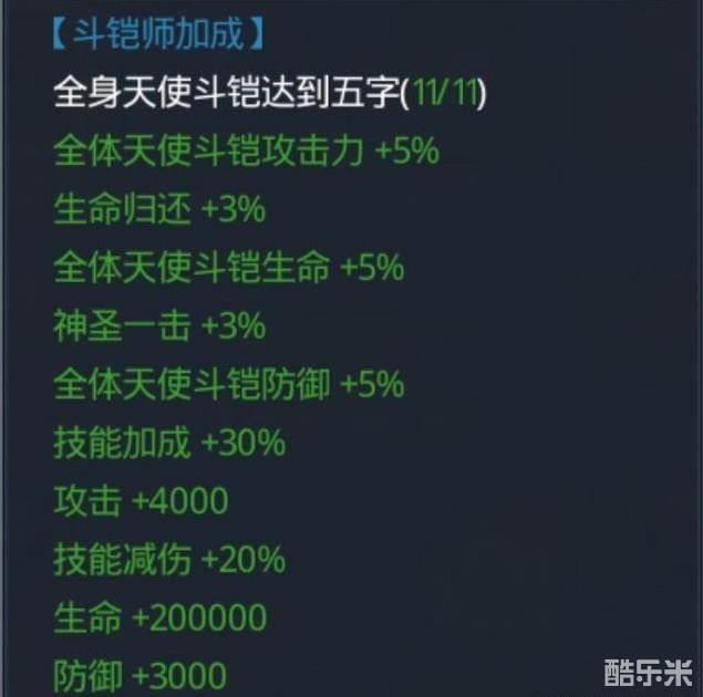 斗凯还有自身特有的套装属性,数据如下图所示,整体讲提升不大,算是中规中矩的属性(毕竟斗铠的强悍不在这里,而是单件的五字属性 )