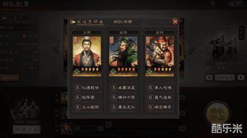 该阵容由主将刘备(辅助)、关羽(兵刃输出)、张飞(兵刃输出)组成,兵种可以选择骑兵、枪兵、盾兵皆可,都能达到2S1A的组合,激活蜀国阵营加成,激活桃园结义缘分。