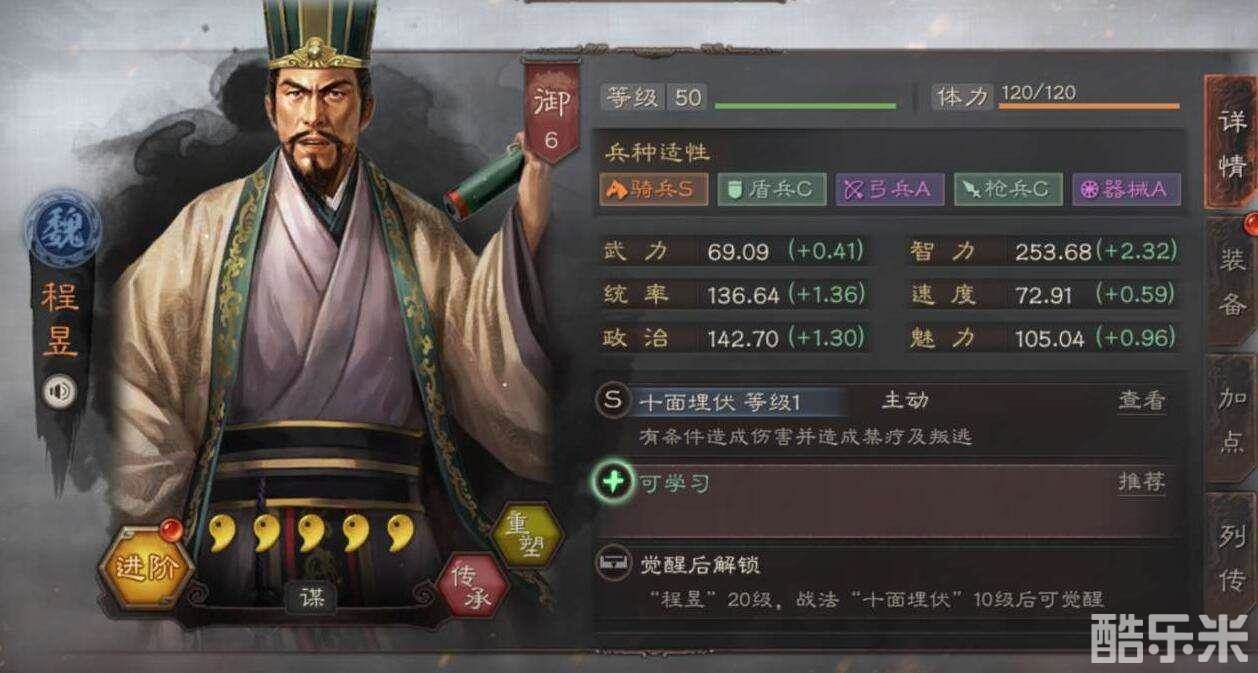 综上,程昱的定位为:骑兵(勉强凑合也可用弓兵)队伍中的副将输出位。