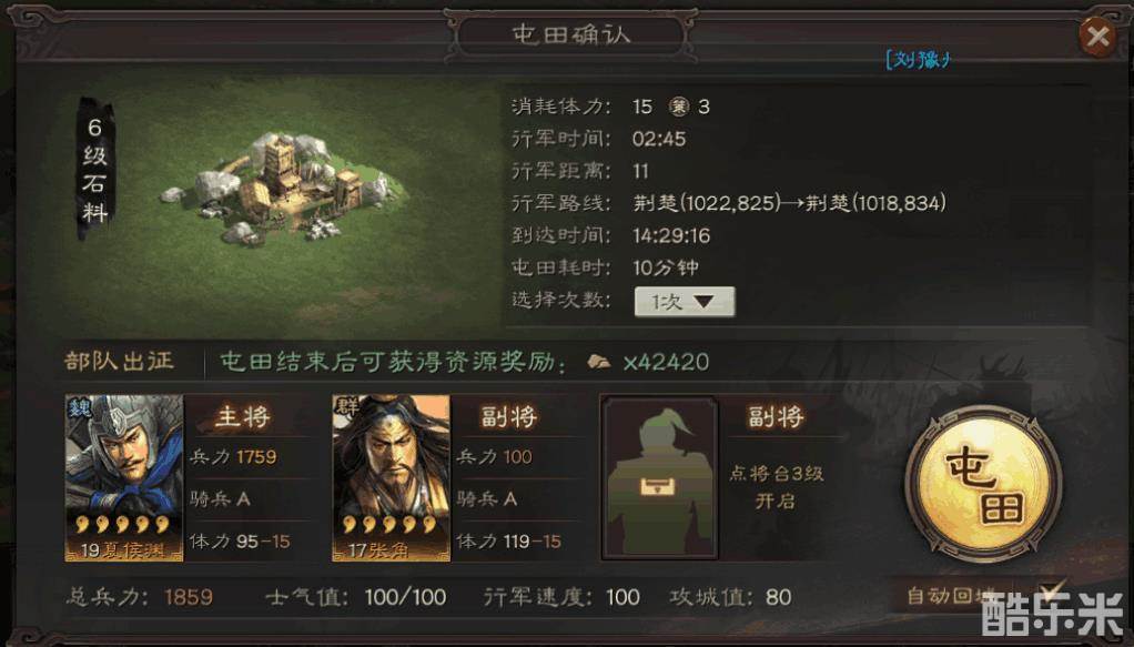 每次屯田10分钟需要消耗3个策书、15点武将体力