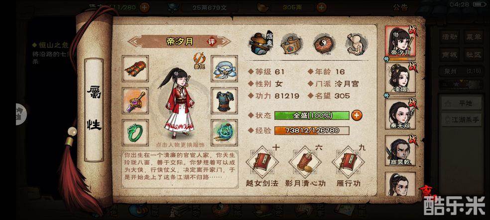 烟雨江湖南知意是游戏当中随从,有着强大的免伤天赋,关于角色的加点方法是什么,该如何发挥角色的最大优势出来,很多玩家也是非常的好奇,不知道该如何参与的玩家可以来看看酷乐米小编最新的内容分享,不要错过了。烟雨江湖南知意加点方法一览1、加点加点优先身法和根骨,其次内息。身法在110-150之间都是可以的,