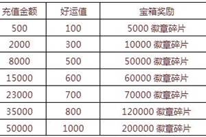 特惠好礼(每日刷新)【活动时间】2019年5月8日00:00:00-2019年5月9日23:59:59【活动内容】活动期间可通过充值金币获得好运值,积累好运值即可打开宝箱奖励,超多的徽章碎片,徽章等级