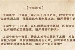 烟雨江湖江湖杂谈答案最新是什么?烟雨江湖i今天更新了江湖杂谈,很多玩家不知道有奖问答答案是什么,下面小编给大家整理了烟雨江湖江湖杂谈答案最新,快来看看吧!烟雨江湖江湖杂谈答案最新:1.江湖中有一门武学