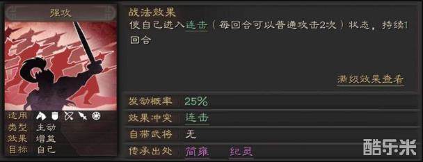 连击:施加连击状态,会让武将获得额外进行一次普通攻击的能力。当连击状态配合突击战法时,可以发挥出突击战法的双倍效果。在战斗中会被缴械状态(无法进行普通攻击)克制。