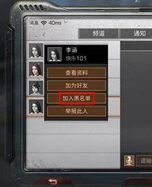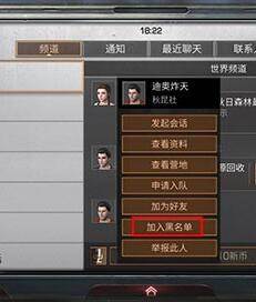 在世界聊天或者是好友聊天里面,点击该成员的头像,然后就会弹出有加入黑名单的选项,选择即可成功拉黑。