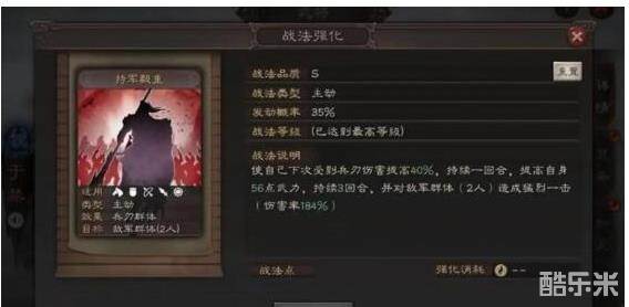 于禁的自带战法持军毅重虽然发动几率只有35%,但效果绝对值得期待。这个战法能让咱们下次受到的兵刃伤害提高,但换来的是3回合56点武力值加成,还能对敌军两人造成184%伤害率的群攻,这输出能力简直不要太强。不过这个战法发动几率确实有点低,可以考虑搭配白眉这类提升发动几率的战法来增强稳定性。下面和酷乐米