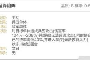 2、陈到-白耳兵(85分):强力的策略伤害战法,触发概率高,刘备、诸葛亮、都督队、邓艾、钟会等均可用。