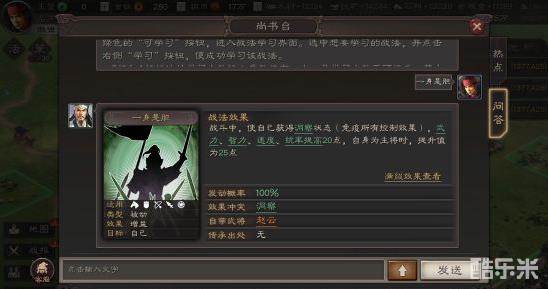 三国志战略版舌战群儒给谁用?三国志战略版舌战群儒有什么效果?下面一起来看看详细的攻略介绍吧!战法效果这个战法的是效果并不是战法等级决定的,它的实战效果取决于面武将的主动战法数量,对面的主动战法数量越多这个战法就越强。就像喷子也要找对人喷才有效果的原理是一样的。舌战群儒适配武将陆逊的自带战法【火烧连营