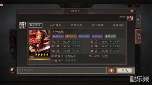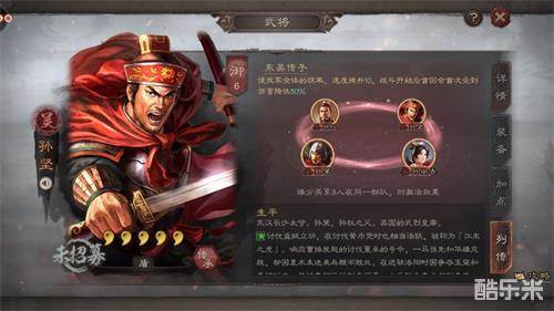 东吴传子:孙坚,孙策,孙权,孙尚香,使我军全体统率,速度提升10,战斗开始后的首回合受到的伤害降低50%,全体吴国武将会带来额外加成。