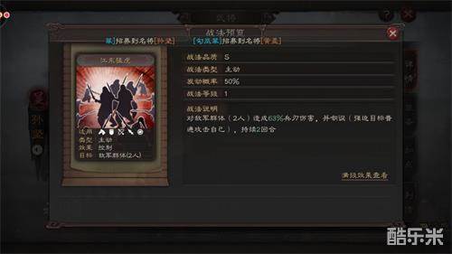 主动战法:江东猛虎,对敌军群体(2人)造成63%兵刃伤害,并嘲讽目标,迫使其攻击自己,持续两回合。