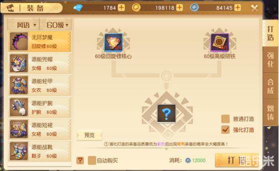装备打造时可预览属性,强化打造装备基础属性区间值高于普通打造装备属性区间值。玩家可以在界面上勾选是进行普通打造还是强化打造。