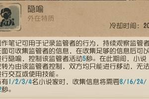 第五人格求生者小说家高阶怎么玩?——————技能解析——————【外在特质-白描】【外在特质-共鸣】【外在特质-隐喻】【外在特质-伏笔】——————天赋推荐——————天赋推荐一:【回光返照】+【破窗