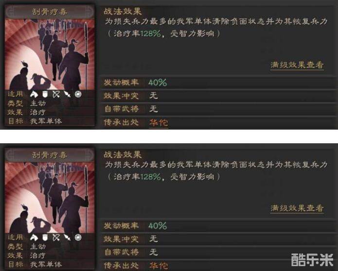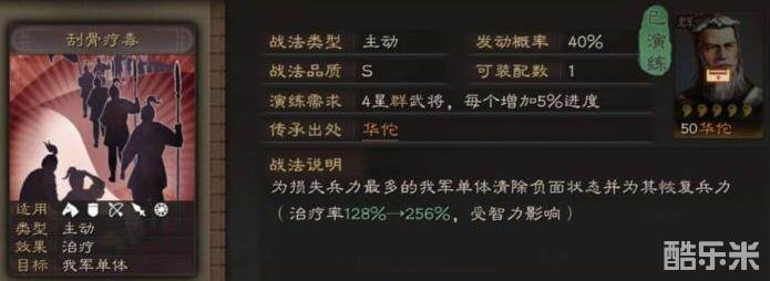 【刮骨疗毒】可从武将华佗传承获得,战法可以针对兵力损失最多的友军单体进行治疗,也是游戏里单体治疗量最高的战法。在治疗的同时还可以清除目标的负面状态,如果目标身上有持续性伤害状态,为其清除无疑能减少他将要受到的伤害。如果目标身上有控制状态,为其清除可以让他继续稳定行动。战法拥有40%的发动几率,没有任何兵种限制,可以随意配合使用。