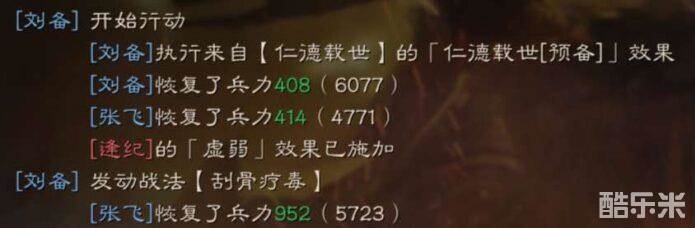 刘备的自带战法【仁德载世】能够稳定的为群体治疗,并有几率使敌军单体陷入虚弱。配备刮骨疗毒后可以增加刘备的治疗能力,让刘备奶量更足。
