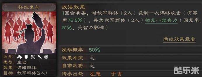杯蛇鬼车是由左慈、于吉传承而来,战法发动后需要1回合准备,对敌军2人造成伤害同时恢复我军2人兵力。和刮骨疗毒搭配可以增强治疗能力。