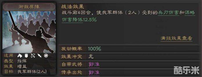 御敌屏障是由郭准传承而来,前4回合使我军2人受到伤害降低。配备刮骨疗毒便能组成强大的防御配置。