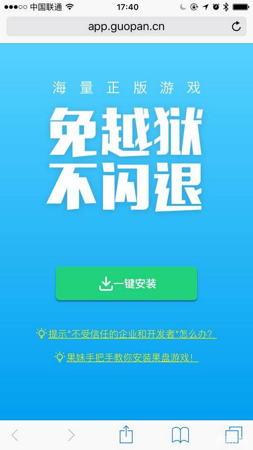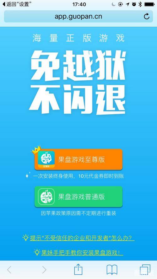 5.安装完成描述文件后,回到Safari页面,选择安装果盘游戏至尊版或普通版。