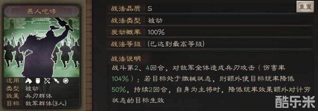 【被动战法】燕人咆哮:战斗第2、4回合对全体造成兵刃伤害,若目标处于缴械状态则额外使目标统率降低持续2回合。身为主将时,降低统率效果也会对计穷状态的目标生效。
