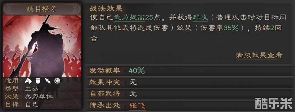 奋突:普通攻击后提升自己造成的兵刃伤害,并且有概率使目标缴械。(配合自带战法效果不错,并且让张飞具备了不太稳定的增伤和控制能力,作为辅助效果更佳)