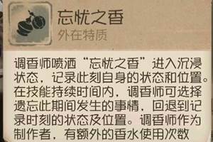 第五人格忘忧之香是游戏中的道具之一,那么忘忧之香道具的作用是什么,很多玩家可能还不是很清楚,今天为大家带来第五人格忘忧之香道具作用效果介绍。忘忧之香介绍物品效果:喷洒忘忧之香进入沉浸状态,记录此刻自身