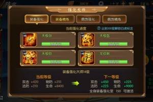 当主公和武将全身的装备、配饰、专宝,在培养到一定程度时,就可以激活强化大师的属性加成,同时强化大师也给强化装备提供了一个快捷的入口,有了它,强化装备更加方便。强化大师具体又细分为以下几个。【装备强化】