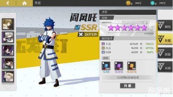 SSR阎风吒(飞廉)、SSR灵装曹焱兵(张郃)都是开服活动可以免费获得的,并且还能获得大量的碎片用来升星,完成新手任务能获得的碎片差不多够阎风吒、飞廉双7星,基础属性极高,并且传记副本每天也可以刷飞廉碎片,用阎风吒(飞廉)替换曹玄亮(唐流雨)最为合适,由于SSR级卡牌升星需求碎片量极大,所以优先升星阎风吒(飞廉),通过前期阵容推图获得的资源积累,基本可以做到无缝衔接新阵容。灵装曹焱兵和张郃本身就是SSR,可以先作为工具人用于施加“灼烧”BUFF,北落师门同理。