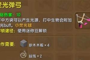 在迷你世界游戏中有有很多枪械需要子弹才能打出伤害,而荧光弹弓就是其中枪械的一种,那么迷你世界荧光弹弓要怎么得呢?下面小五就来为大家讲讲吧!荧光弹弓解锁要求:使用迷你豆解锁获得方法:通过工具箱制作制作需