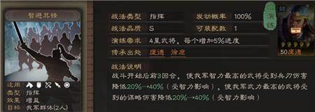 【指挥战法】暂避其锋:战斗开始后前3回合,使我军智力最高的武将受到的兵刃伤害降低,使我军武力最高的武将受到的谋略伤害降低。