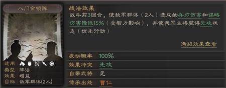 八门金锁阵是由曹仁传承而来,可以使敌军2人造成的伤害降低。和暂避其锋配备可以造成一增一减的效果,使得组合的减伤效果进一步加强。