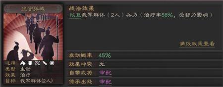 坐守孤城是由审配传承而来,战法可以为群体2人恢复兵力。搭配暂避其锋打持久战会更具优势。